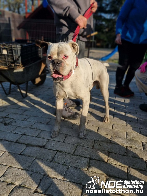 Bubi 2020-as születésű, fehér színű, vágatlan fülű és farkú boxer kan, aki családi tragédia miatt került a NOÉ Boxer fajtamentés gondozásába társával, Mazsolával együtt.