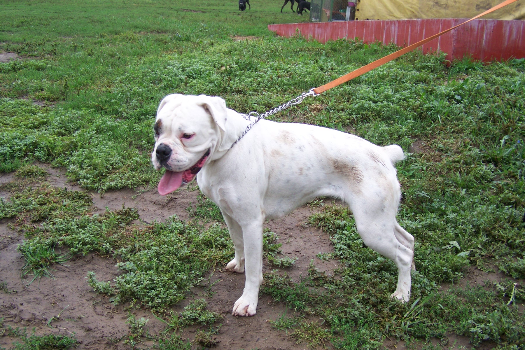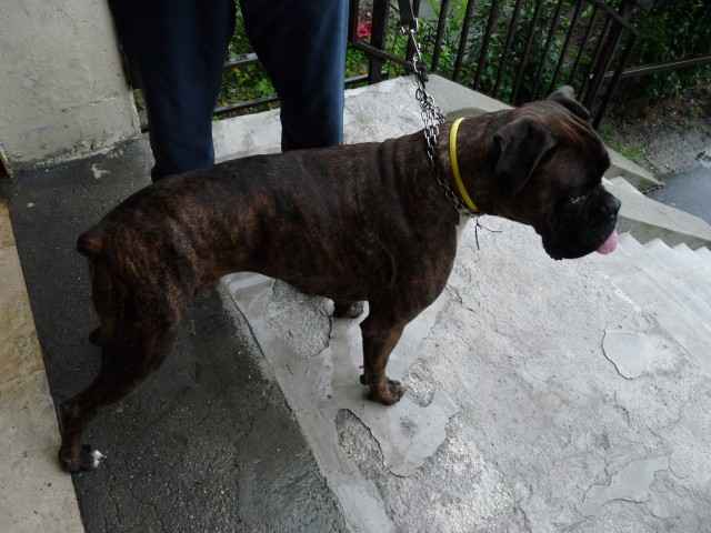 Szerencsére boxerből van, így a szeretgetésnek köszönhetően a lelke hamar kisimult, és mostmár seggrázással, vigyorogva várja a simogatást, nyoma sincs annak a rettegő kutyának, akit elhoztunk.
