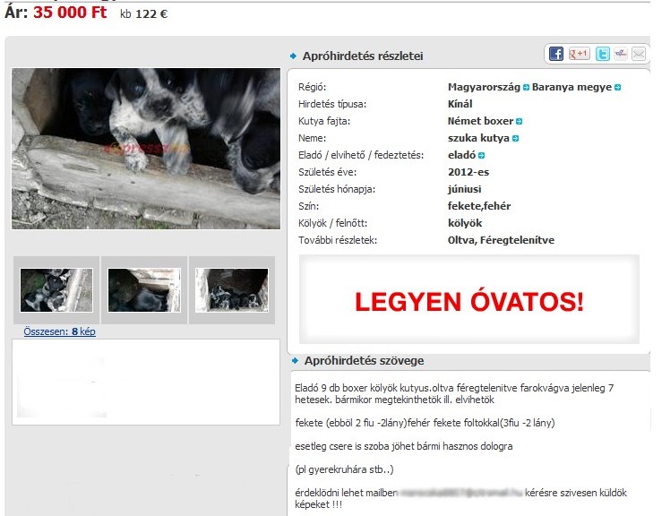 Olcsó húsnak, híg a leve...tartja a régi mondás, ami erre a cikkünkre 100%-osan igaz lesz. A minap egy boxeres ismerősöm megosztott egy hirdetési portálon lelt posztot, ahol német boxer kölyköket árulnak 35.000 Ft-ért.